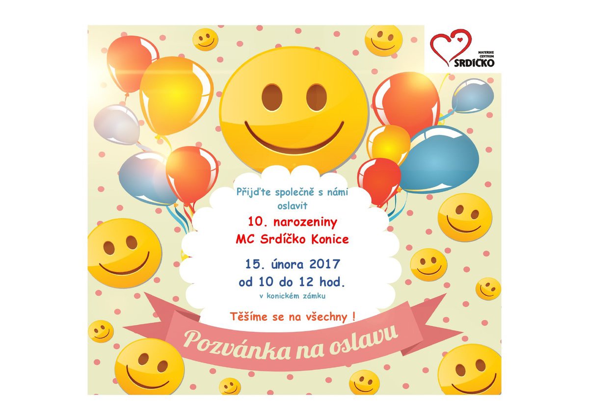 Pozvánka na oslavu 10. narozenin Mateřského centra Srdíčko na konickém zámku. Dne 15. února 2017 od 10.00.